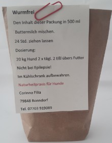 Entweder mit Wasser anrühren oder direkt unter das Futter mischen. Alternativ kann die Kräutermischung auch mit Joghurt oder Frischkäse verrührt und gefüttert werden. Für Hunde die beides nicht annehmen, einen Tee kochen und in kleinen Mengen übers Futter geben. Idealerweise morgens verabreichen, damit der Hund sich ausreichend lösen kann.